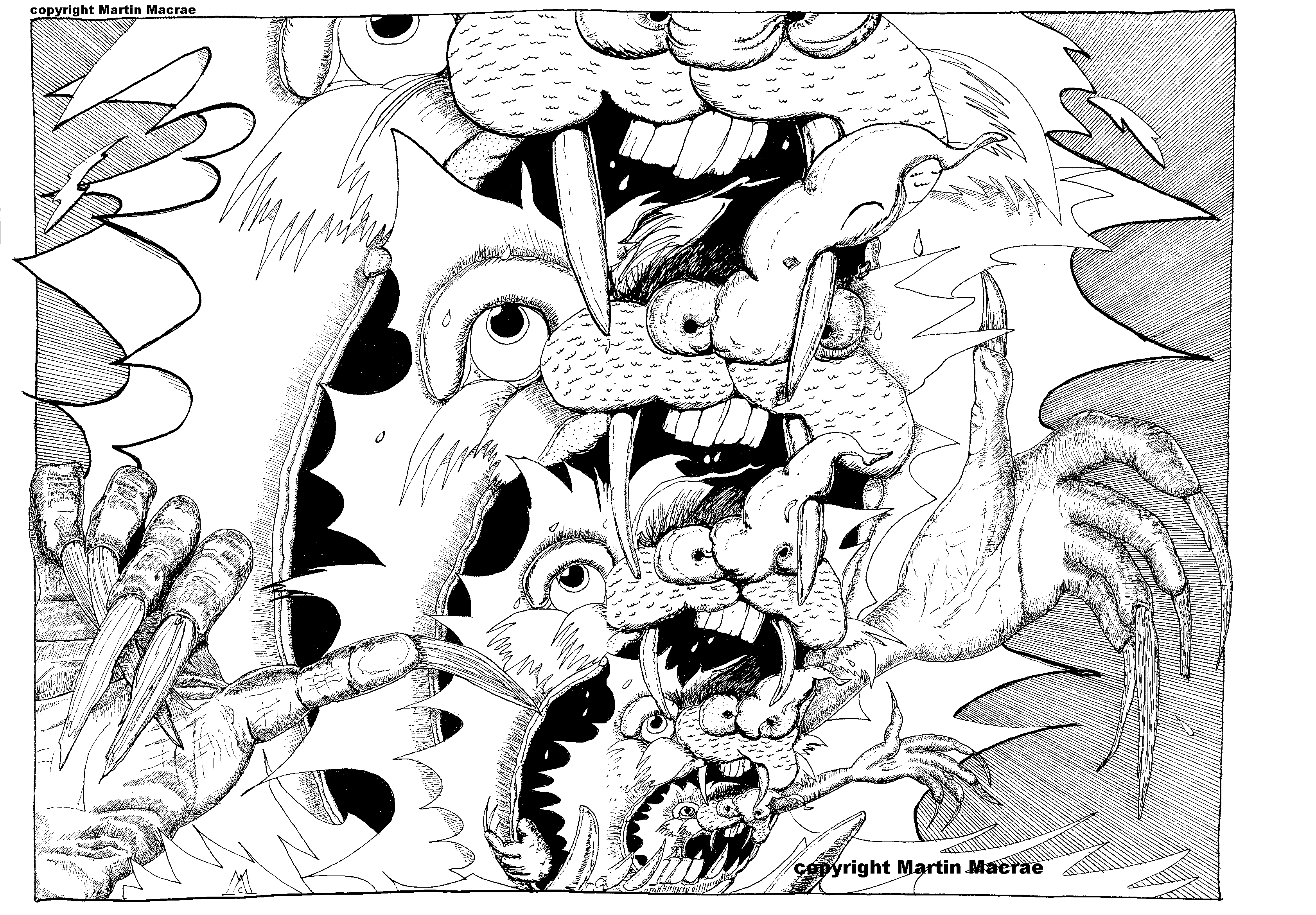 I started by drawing the third biggest monster, then realized it could be eating itself, and drew all the other monsters around it.