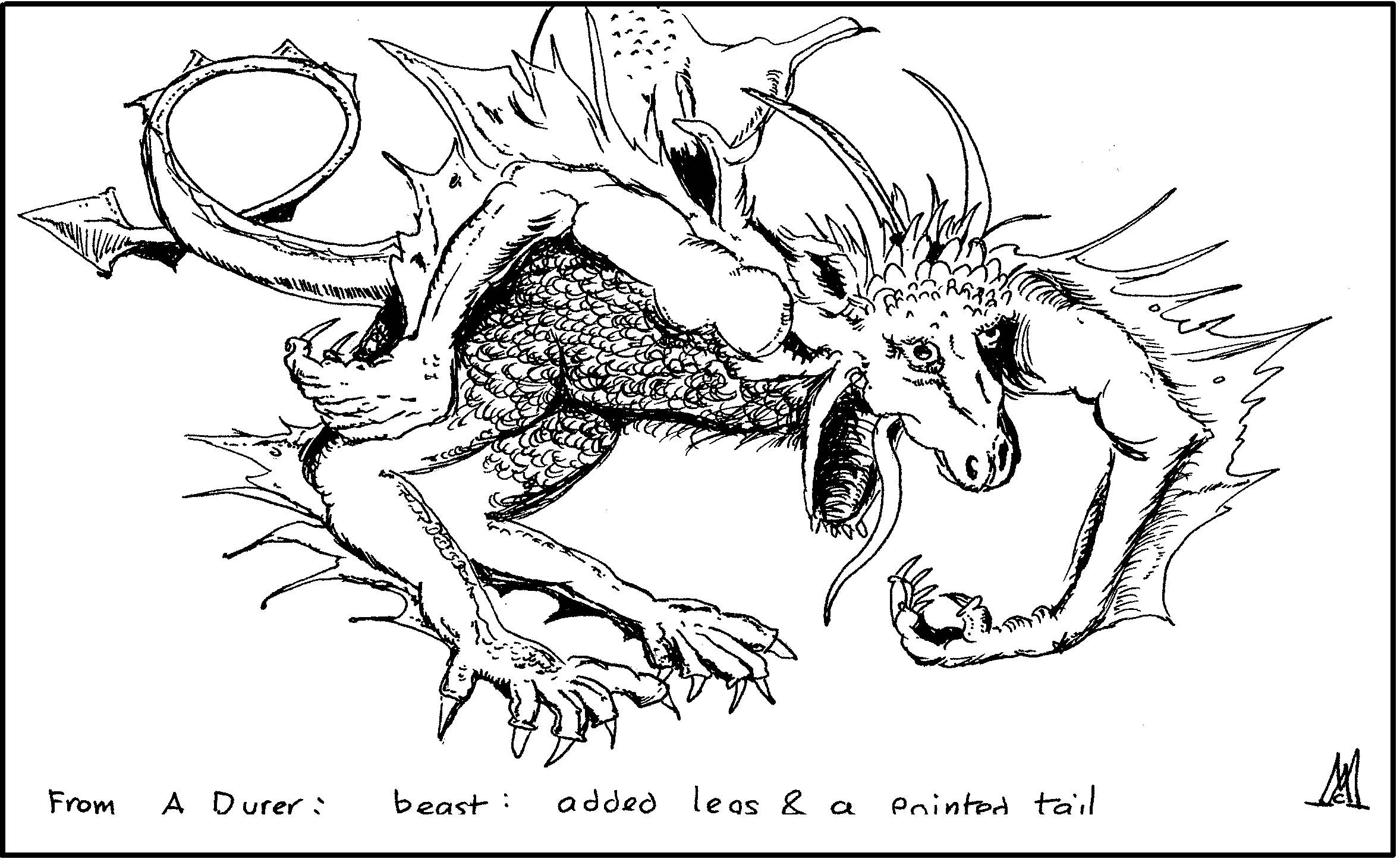 Detail from Dürer's Slaying of the Dragon by St. Michael, a print, which can be seen at Link to a print of St. Michaels fight against the dragon by Albricht Durer This was my first sketch from Dürer's work, and is of the goblin/devil/dragon being stabbed by St Michael, turned round and has added legs etc. I have started an A2 of the whole picture, updated in the modern idiom with roads, skyscrapers etc ......if I get round to finishing it.