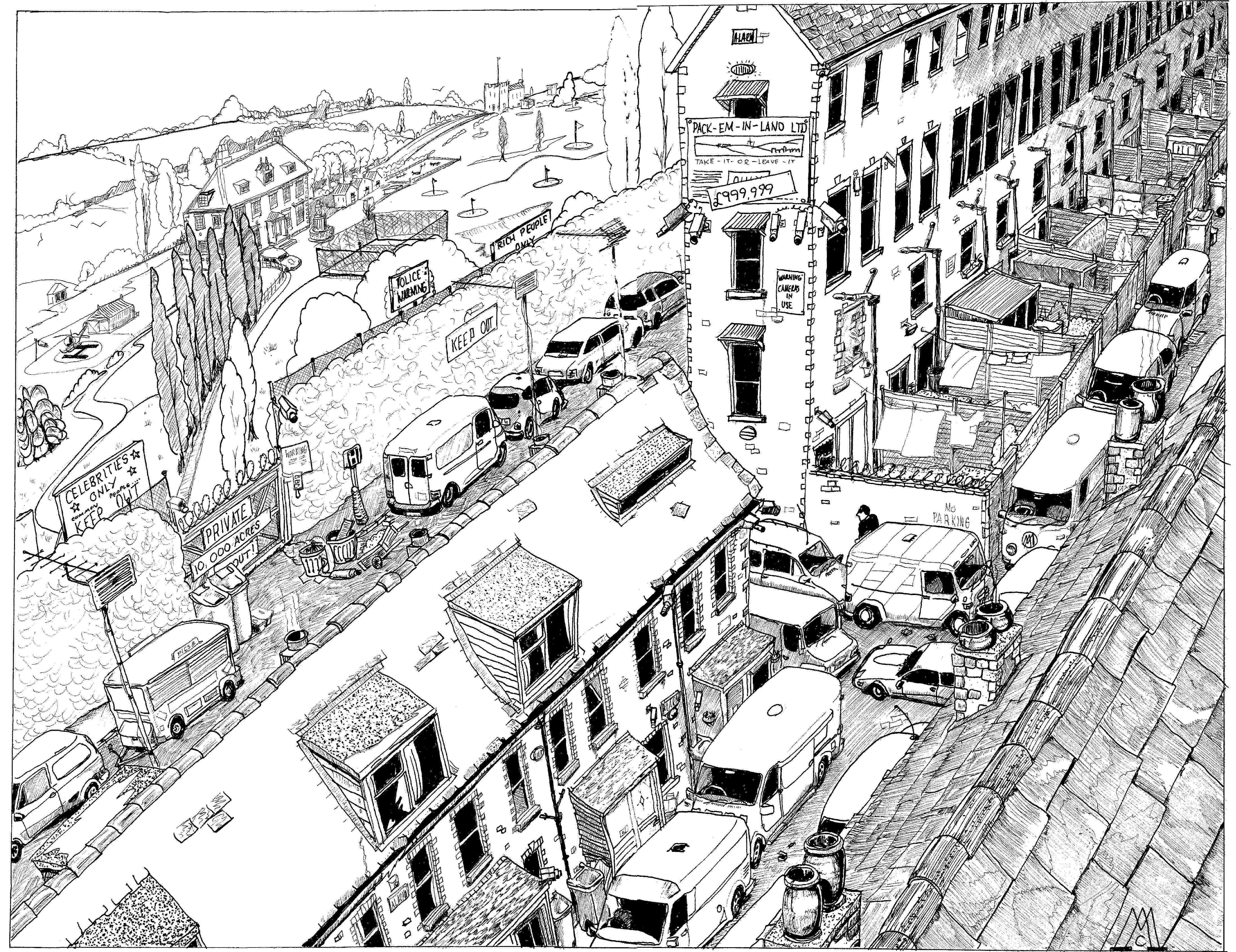 This cartoon points out that fact that 99% of the people in Britain live on 10% of the land,